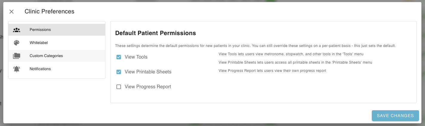The Preferences tab, found in the toolbar at the top of the My Clinic page, provides tools to shape both the look and the functionality of your clinic’s NeuroVisual Trainer account. Here you can set default permissions for new patients, customize clinic branding throughout the app, and create custom categories to organize your clinic's VT exercises library.