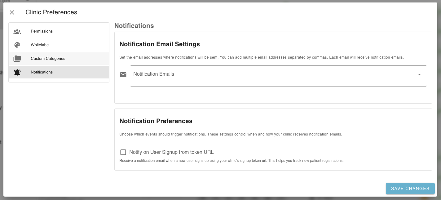 • For clinics who use a signup token url for patients to enroll themselves, Admins can manage notification emails to alert specific clinic staff when a new patient has set up their account.